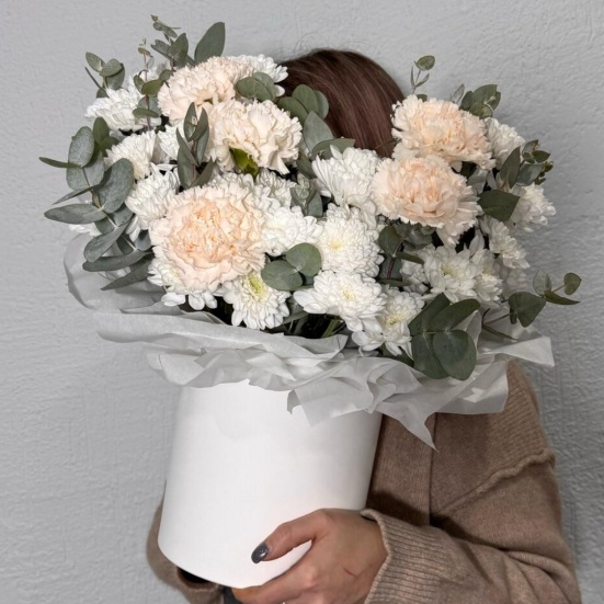Коробка из кустовых хризантем и диантуса